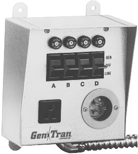 4 single-pole, 120 volt circuits, 15 amps maximum per circuit, 15 amps maximum combined load at 125 volts. Not suitable for powering 240 volt loads. Each circuit provided with non-defeatable (break-before-make) double throw switch protected with a resettable circuit breaker. Male 5-15P power inlet receptacle for standard 15 amp 3-prong type extension cord connection to backup source, 1875 watt maximum. Convenience outlet that is "live" under backup power. The 1/2 x 18 inch flexible conduit is pre-wired for easy connection to existing residential load center panel. Installs in less than an hour, without pulling the electric meter or installing a sub-panel. Suitable only for circuits protected with up to 20 amp breakers or fuses. UL listed and CSA certified. NEMA 1 indoor surface mount enclosure. Exclusive Gen/Tran® 24 month warranty. See Gen/Tran® Instruction Book. Made in USA