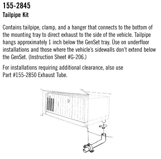 Contains tailpipe, clamp, and a hanger that connects to the bottom of the mounting tray to direct exhaust to the side of the RV. Tailpipe hangs approximately 1" below the genset tray. Use on underfloor installations and those where the RV's side walls don't extend below the genset. For installations requiring additional clearance, also use part #155-2850 Exhaust Tube.