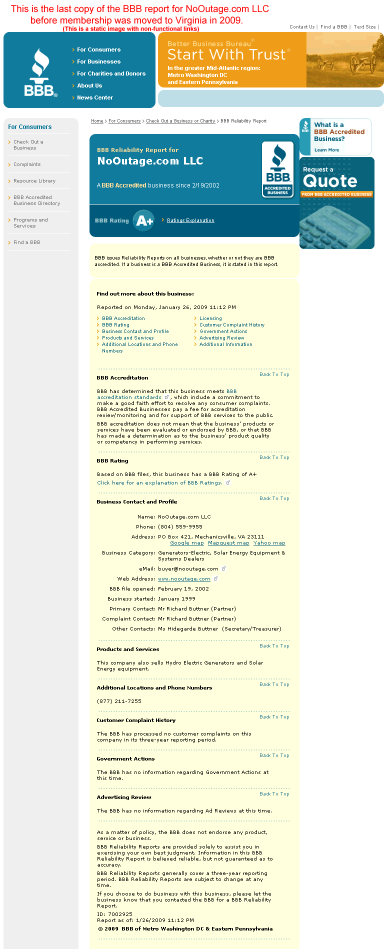 NoOutage.com LLC was formed in January 1999 in Maryland and became a member of the Better Business Bureau of Metropolitan Washington DC on 2/19/2002. After relocating to Virginia in July 2008 the membership had to be changed to the Better Business Bureau of Central Virginia. The links below provide the information about both memberships.