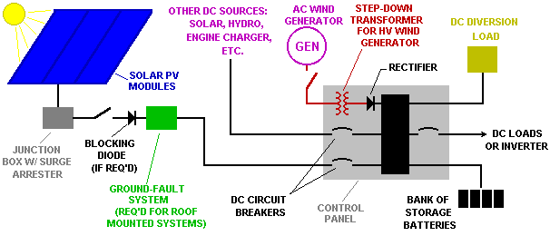 Configuration E is based primarily on the use of alternative energy sources such as solar photovoltaic (PV) modules, wind generators and hydroelectric generators. These configurations can be economical alternatives to the high cost of extending utility lines to remote areas. Since the purchase cost of these systems is usually higher on a per-watt basis than conventional electricity sources, special attention should be given to the use of energy efficient appliances. Electric space heating, cooking, water heating and refrigeration should be avoided and replaced with propane or other fuel sources. Typical configurations are described below using a number of sub-categories.