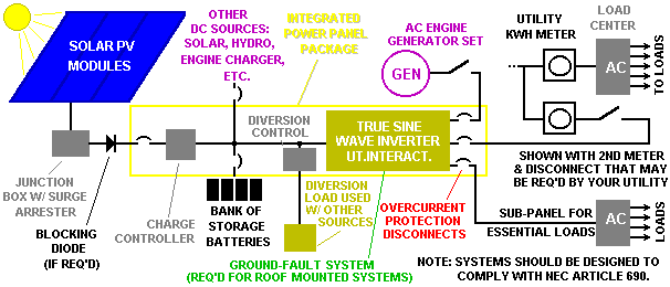 Configuration E7 is based primarily on utility power with supplemental onsite solar electric generation. It is similar to Configuration E6 except that battery backup is added for providing AC power during utility outages. Optional engine generator backup and/or supplemental wind or hydroelectric generation can be used. The control and distribution design and installation can be simplified by using an Integrated Power Panel which contains all the utility inter-active inverter(s), ground fault protection, charge control, diversion load control, overcurrent protection and disconnects. The inverter is designed with advanced protective systems that detect utility power outages to avoid dangerous backfeed into the grid. When a power outage occurs, the inverter(s) separate from the grid and continue to power essential loads via a sub-panel. The solar generated electricity offsets some of that normally provided by the utility. Depending on system size and load fluctuations it is possible to "sell" excess electricity back to the utility.