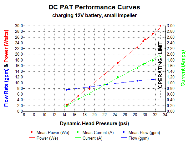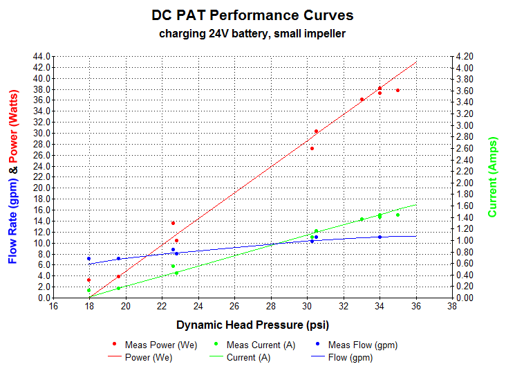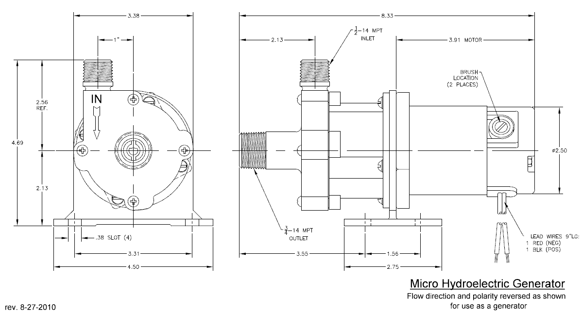 Will produce up to approximately 28 Watts 1.9 Amps maximum output at a nominal 12Vdc or approximately 40 Watts 1.6 Amps at 24Vdc. Water source must be 35 psi head pressure at inlet with 12 gpm available to achieve maximum output. Includes a permanent magnet dc generator (motor) with long life replaceable brushes. Impeller is magnetically coupled which means there are no seals to wear out and replace.