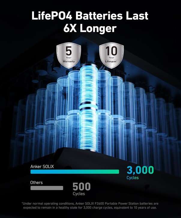 infiniPower Durability for 10 Years: Anker SOLIX F2600 is built to last. It comes with LiFePO4 batteries, smart temperature control, industrial-grade components, and an impact-resistant design. So power every day for 10 years.