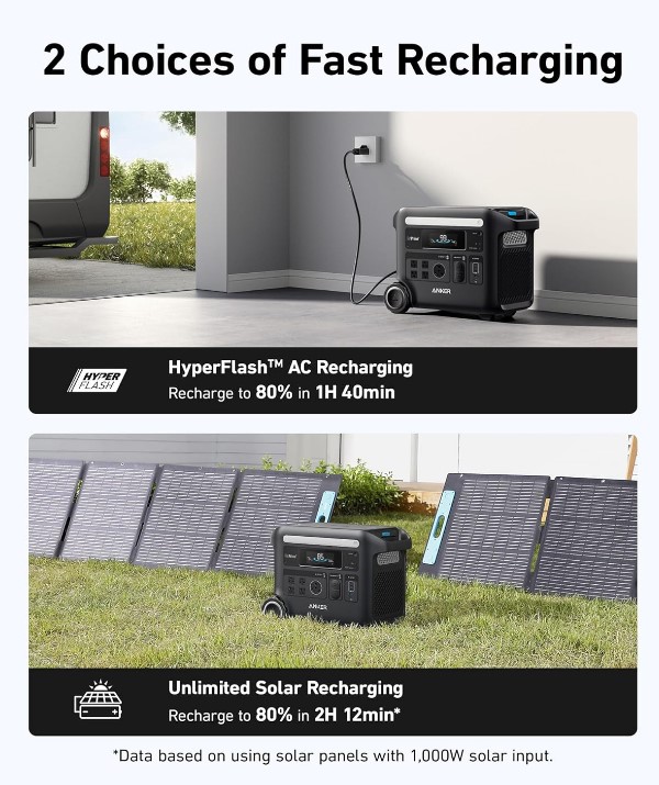 2 High-Speed Recharging Choices: Now you're in control of your fast recharging. Recharge to 80% in just 2 hours with solar, or even faster with HyperFlash. It recharges to 80% in 1 hour and 40 minutes.