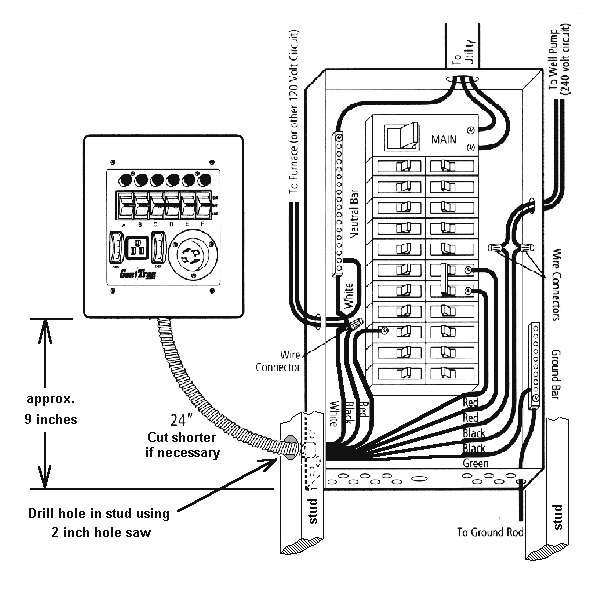 | 4. | Then put a 2 inch hole saw on your drill and reach down into the wall through the hole you cut for the Gen/Tran unit. Using the 1/4 inch hole as a guide hole drill a 2 inch hole back through the stud and stop when reaching the metal side of your load center box. |