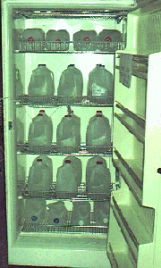 The freezer contents was simulated using jugs of water. Initial monitoring was performed using a digital multimeter with a temperature probe connected to a computer for frequent automatic data logging. During later time periods when the temperature was changing very slowly, data was recorded manually approximately twice daily. The probe was positioned in free air in a central location in the freezer and the jugs were spaced to allow free air circulation throughout the interior. See Figure 1 showing the setup for the first test using 12 gallons (100 pounds) of ice. The freezer was located in a basement with a relatively cool ambient of 68 F. The freezer itself was a commercial type old model (early 70s vintage). More recent models probably have better thermal insulation. Thus, results herein probably show a faster warm-up rate than newer models.