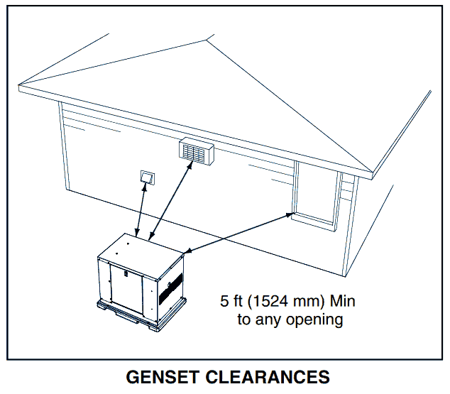 image above to enlargeNFPA 37 2010, section 4.1.4 Engines Located Outdoors states, "Engines, and their weatherproof housings if provided, that are installed outdoors shall be located at least 5 ft. from openings in walls and at least 5 ft. from structures having combustible walls." Leave at least 5 ft (or more if the housing and instructions for your particular unit require it) all around the genset enclosure for access to the inside (NEC Art. 110-26a, Art. 110-26b). The genset must be at least 5 ft from any opening (window, door, vent, etc.) in a wall, and the exhaust must not be able to accumulate in any occupied area. See figure below. Note that some jurisdictions require larger clearances such as 10 feet. Verify requirements with your local authorities.