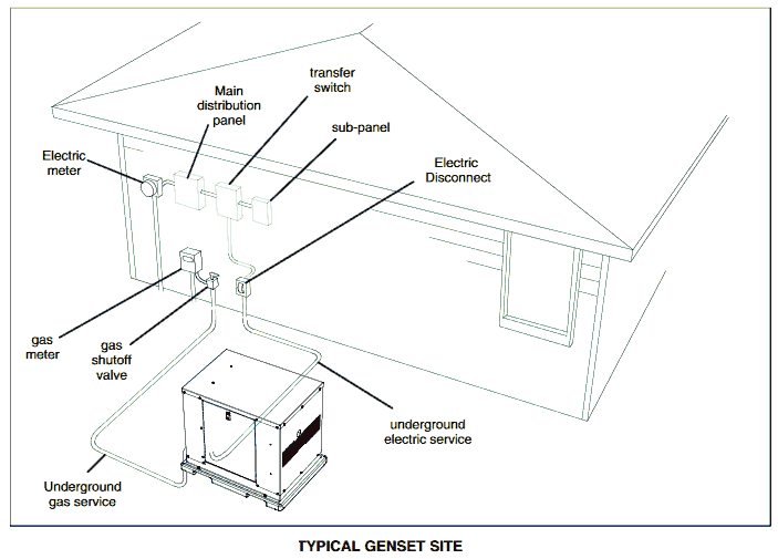 Choose a site close to the electric service and fuel supply lines (natural gas, propane, or diesel). The image below shows a typical natural gas installation. The main distribution panel, transfer switch and sub-panels are inside the building in this example.