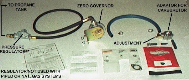 Kit consists of pressure regulator for your propane tank, 4 feet of connecting hose, and a special adapter designed to fit your particular engine. Also comes with general instructions so you or your local gas man can install. When connected to a natural gas or piped supply, the pressure regulator is not normally used but you will need to add a manual shutoff valve. Due to the lower energy content of natural gas, your generator maximum capacity must be derated about 20% when using natural gas. But no derating is necessary when LPG is used.