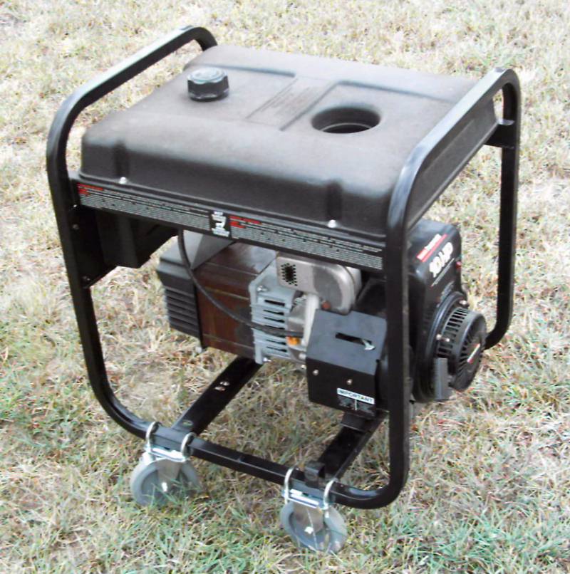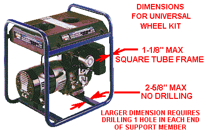 Wheel kit for portable generator and water pump models with tubular frames. Unlike the cheaper kits that come with only two wheels, this kit has four wheels which eliminates the one-end lifting necessary to move the generator. Heavy duty construction. Will support weight of generators of several hundred pounds since each wheel is rated at 145 lbs. Large 5" diameter wheel size will easily roll over most surfaces. Fits generators that have 1 inch or 1-1/8 inch square tubular frames and an engine support of up to 2-5/8" inches wide. See dimensional details. Wider supports require drilling one 5/16" diameter hole in each end. As shown in the photos above, this wheel kit will fit many portable generators without any drilling.
