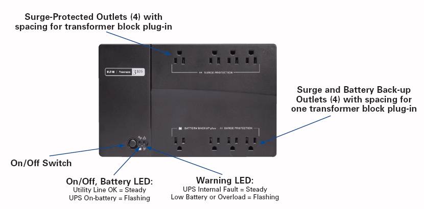 * Keeps essential systems running through power outages (four outlets with surge suppression and battery backup