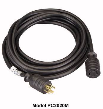 20 amp, 125/250 Volts, super capacity 12 Gauge 4 conductor wire, 20 feet, type SJTW water resistant 60C FT2 300V insulation. For connecting portable generator to transfer switches, panels or inlet boxes. NEMA twist lock L1420 plug and connector molded on each end of cable. UL/cUL listed and CSA certified. Exclusive 24 month warranty.