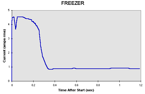 Voltage 115 V AC Frequency 60 Hz Amps 5.0 Mfr. Date early to mid 1970s Results of one measurement are shown in the plot below. It shows a maximum inrush current of less than 5 amps which lasts only about 0.3 seconds. Also, the running current is significantly less than the nameplate value. It should be noted that most freezers are "frost free." However, this one is not.