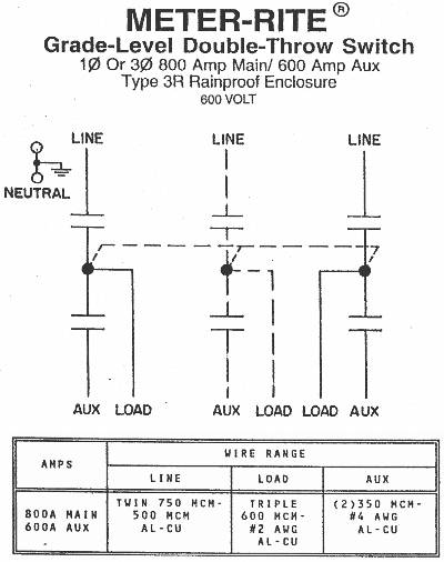 For use with standby generators to transfer loads between utility power and auxiliary power. Two position, with quick-make, quick-break contacts designed to minimize contact arcing and prolong contact life. Aluminum NEMA 3R outdoor enclosure for wall mounting. Ample wiring space. Rated for 800 amps at 600 volts max. Lugs for aluminum and copper wire included. Not UL listed. Manually-operated switch suitable for use in accordance with article 702 of the National Electric Code, ANSI/NFPA 70. Made in USA