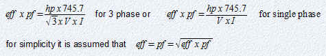 Motor parameters are from 2005 NEC Tables 430.248 and 430.250 for full load currents of ac induction motors running at usual speeds with normal torque characteristics. The value of the (efficiency x power factor) can be calculated from the horsepower, current and voltage given. The Full load efficiency and power factors are estimated as the square root of this value as follows: